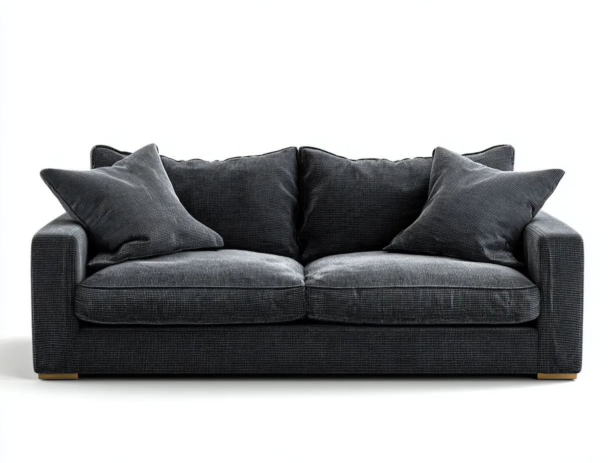 Das Sofa ist mit einem robusten Stoffbezug in Dunkelgrau ausgestattet und wird von einer stabilen Holzkonstruktion getragen. Die Oberfläche zeigt eine dezente Struktur und wirkt angenehm wohnlich. Die Polsterung sorgt für eine gleichmäßige Druckverteilung und unterstützt eine komfortable Sitzhaltung im täglichen Gebrauch.